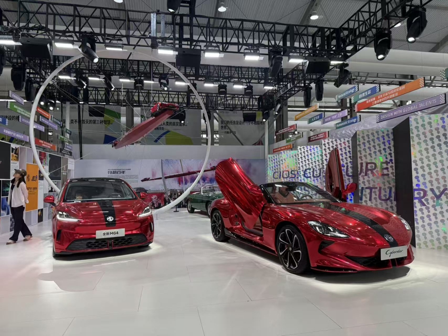 设计是创新链的起点,它串联过去与未来,驱动产业变革。在上汽设计中心展区,你一眼就会被3辆酷炫的车以及空间内巨大的“穿越雕塑”所吸引。展台工作人员介绍,该雕塑由英国著名设计师葛瑞·朱达设计,以红色翼梁为主体,通过金属电缆悬挂于巨大钢圈中心乾盘配资,展现出MG品牌轻量化与巧妙工程设计理念。翼梁之上,MGB与MG Cyberster并肩而立,“远处的MGB是由意大利设计师弗鲁阿于1957年设计的,产量超过50万辆。近处的新款MG Cyberster则跻身电动跑车第一阵营,代表品牌的创新方向”。
