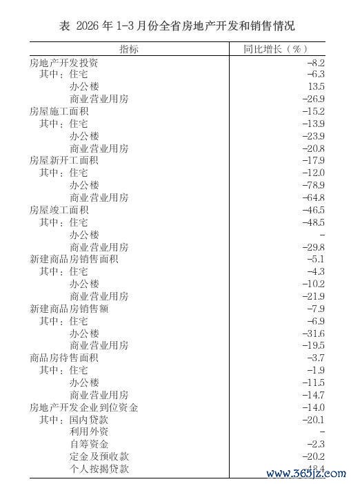 1~3月份,全省新建商品房销售面积同比下降5.1%。其中,住宅销售面积下降4.3%。全省新建商品房销售额下降7.9%。其中,住宅销售额下降6.9%。